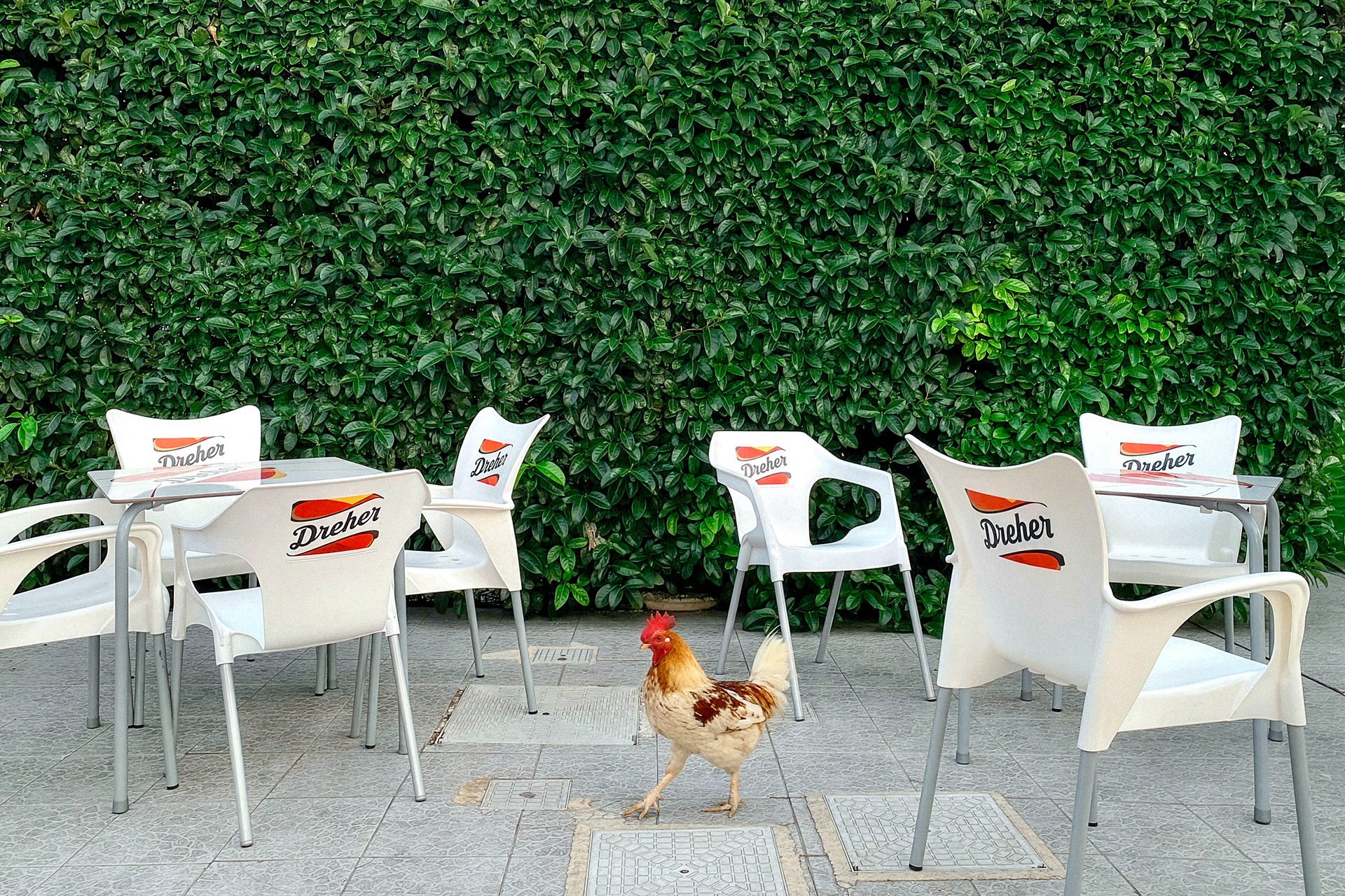 many small chairs in a line and a man sitting on one of them